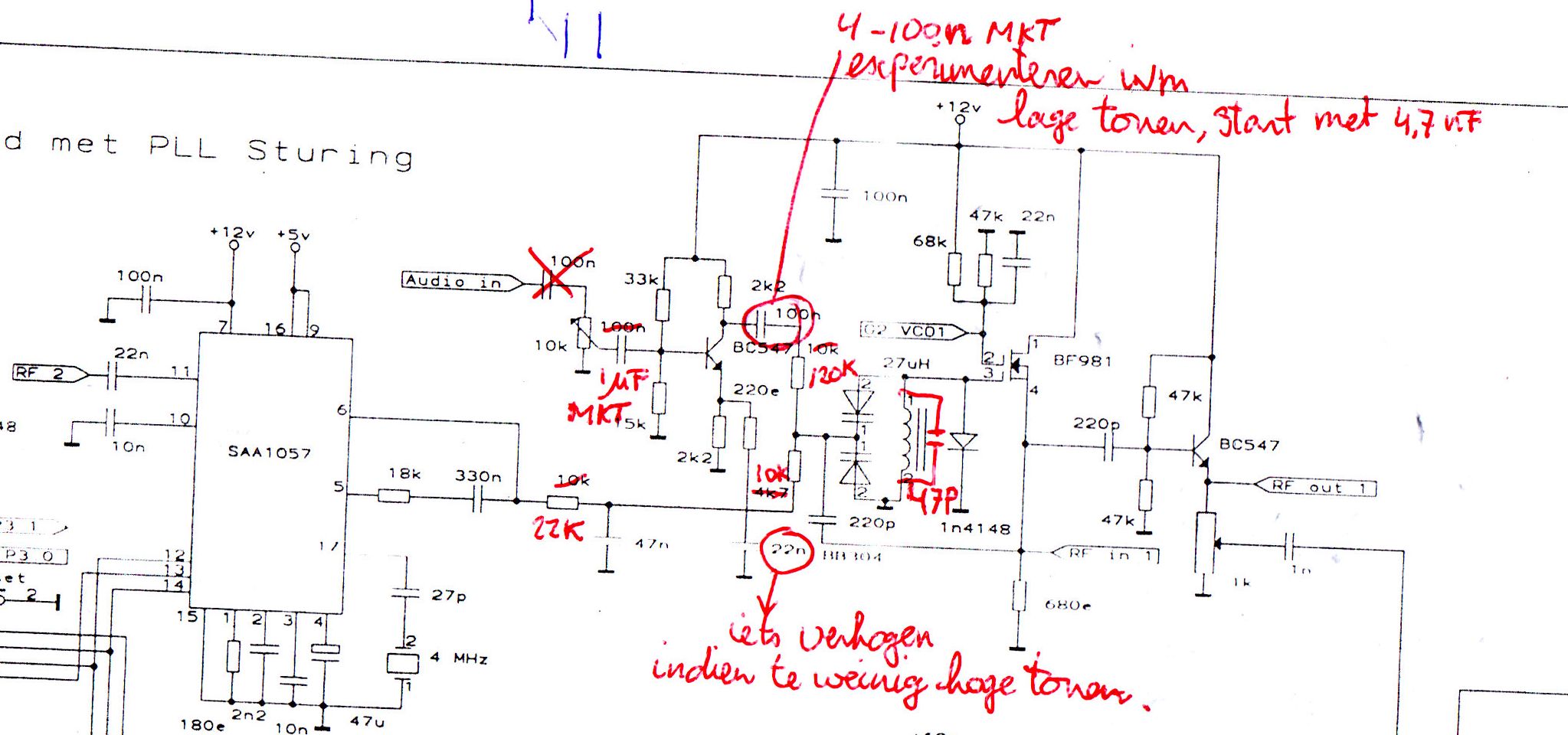Er is eigenlijk niet zoveel meer veranderd. Wel zul je wat met sommige waarden moeten spelen, om voor jouw toepassing het beste geluid te krijgen. Ik zal binnenkort eens alle huidige waarden van componenten opschrijven en hier plaatsen. Dat zal in grote lijnen overeenkomen met bovenstaand schema. Ook zal ik eens een modificatie plaatsen, hoe we de carriers anders kunnen inkoppelen.