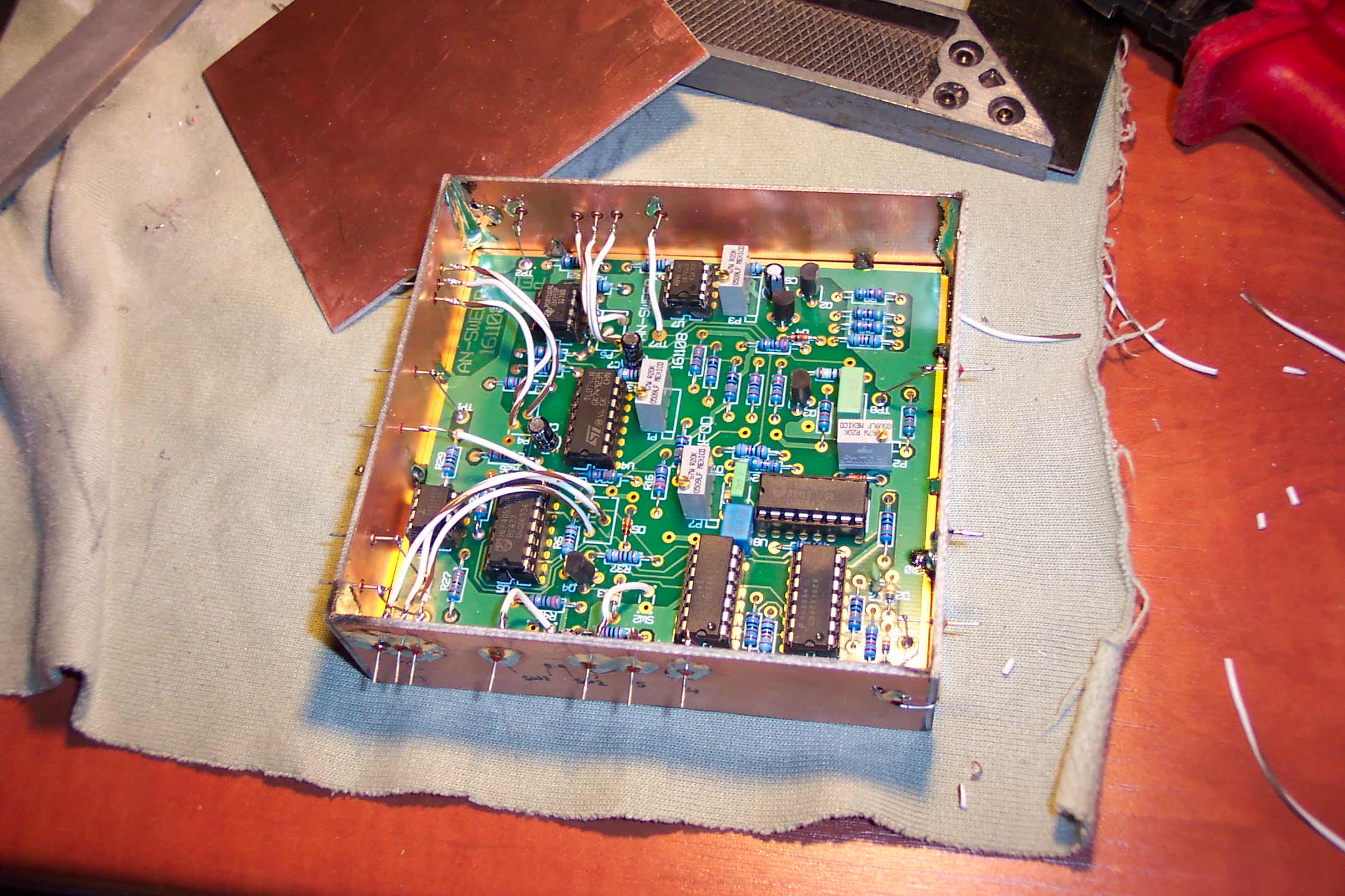 Ik heb gekozen voor koperprint van 3cm hoog, wat een prima vervanger is voor blik (wat ik niet heb). Ik heb gezorgd dat alle zijden contact maken met massa met doorsolderingen. Verder is het bakje helemaal dichtgesoldeerd en er komen kapjes aan de boven en onderkant, welke ook helemaal dichtgesoldeerd gaan worden zodra de sweep goed werkt. Alle aansluitingen zitten met 1nF doorvoer in het kastje.