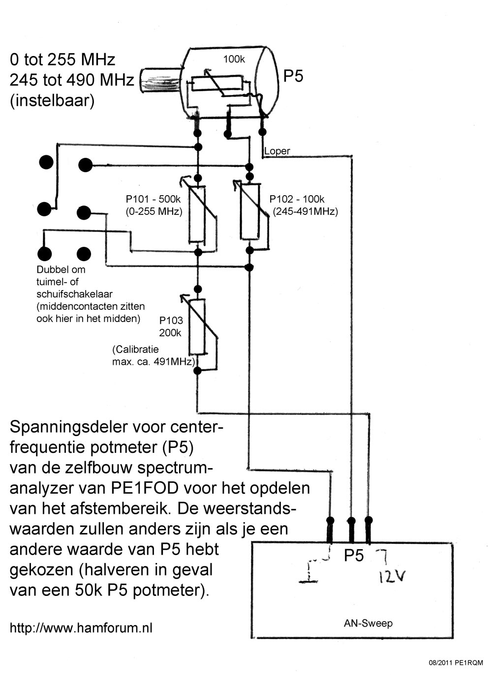 Ik vond het instellen van de frequentie en het centreren van smalband signalen toch wat een te grote uitdaging. Als je al even aan de "center frequentie" potmeter P5 zat, sprong de draaggolf die ik wilde meten in het beeld van de scoop al van links naar rechts. Ik heb een eenvoudige, maar wat mij betreft zeer doeltreffende oplossing. Ik heb door middel van een spanningsdeler met instelpotmetertjes en een schakelaar het afstembereik van de hoofdpotmeter P5 door midden gedeeld: stand 1 van ca. 0 tot 255 MHz en stand 2 van 245 tot 490MHz (beetje overlap in het midden). Zodoende moet je wat meer draaien aan P5 om de frequentie in te stellen en dat kan nu dus twee keer zo nauwkeurig. Bovendien verloopt de frequentie minder als je (per ongeluk) even tegen P5 aan stoot. Even een opmerking over laagste stand, 0 Mhz dus. De tuners schieten iets door onder de nul. De counter gaat dan van 999 weer omlaag. Dat is maar een paar MHz, gewoon negeren