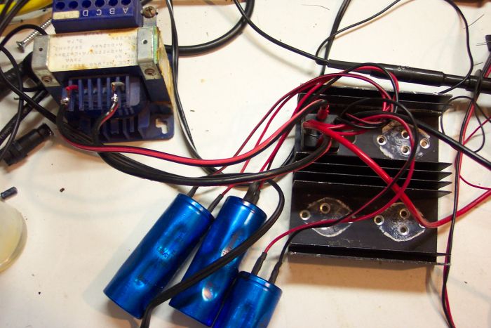 Trafo met gelijkrichtcel op tijdelijk koelblok.