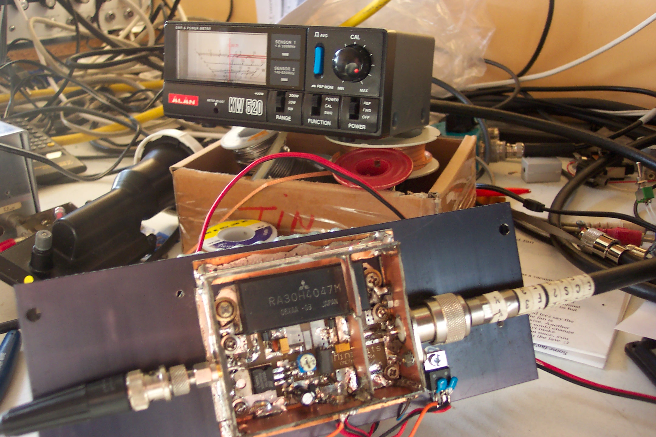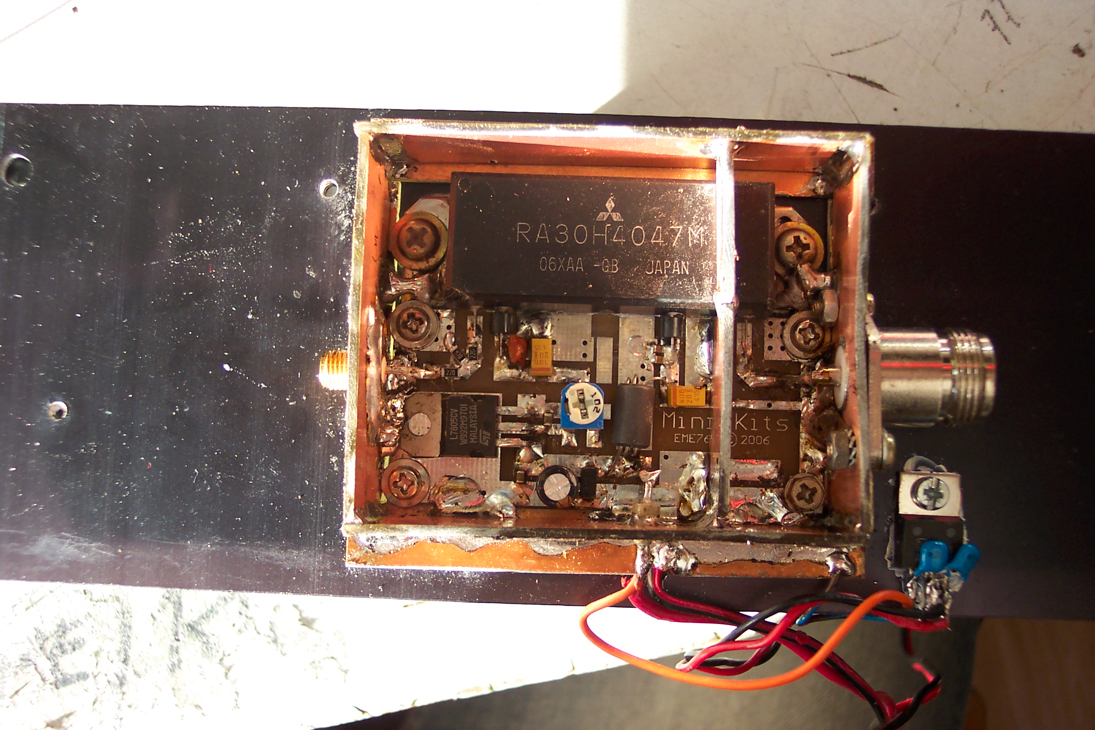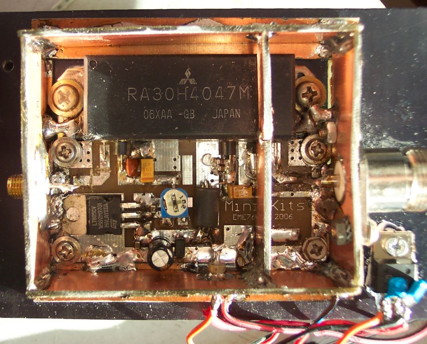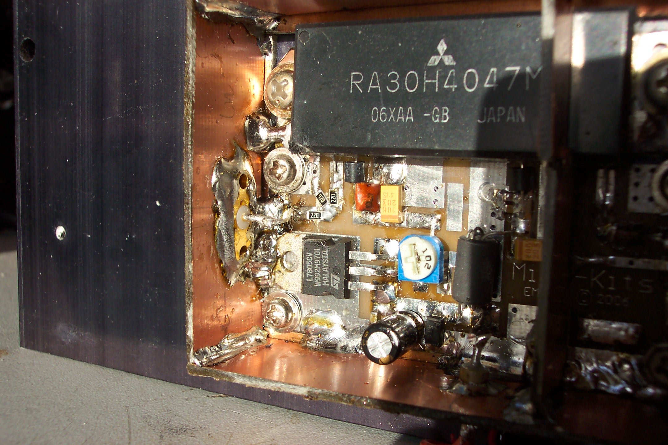 Het gaat om een kit van de firma Minikits met het Mitsubishi module type RA30H4047M. En voor FM liefhebbers: dit ding kan van 50mW FM, meer dan 35Watt maken.