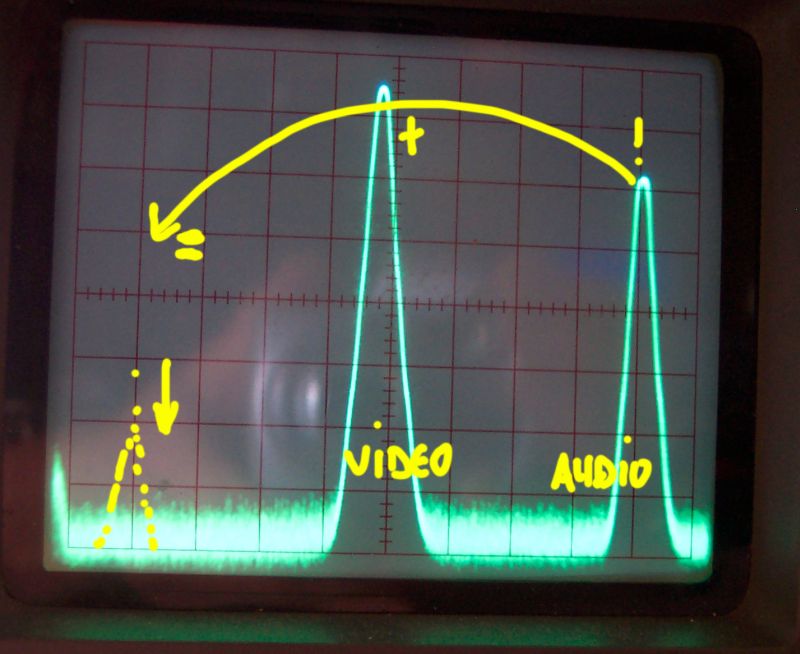 Ieder hokje is 10dB. Het meest rechter signaal is de echte audiocarrier op 439.750 MHz. De middelste draaggolf is de videodraaggolf op 434.250 MHz. Het piekje links is het mengproduct van deze twee.