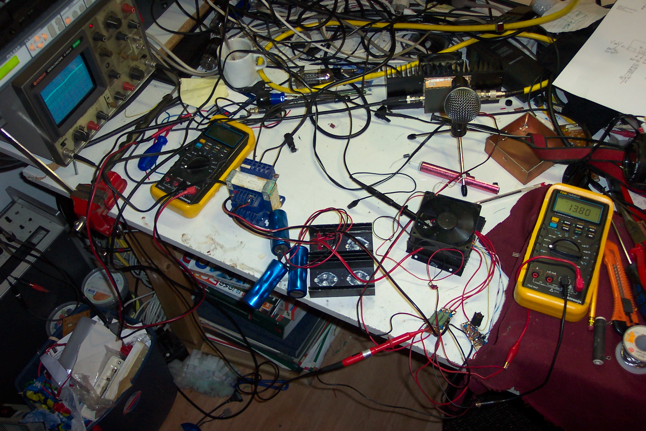 Verder is mij geadviseerd nog enkele draden dikker uit te voeren en vooral korter. Zodra ik alle aanpassingen gedaan heb, dan zal ik hier de meetwaarden plaatsen. Op dit moment is de ruis op de scoop ongeveer 150mV top-top. Met een willekeurige elko werd dat al verlaagd naar 40mVtt. Ik heb van Timo nu een mooie elko gekregen en eens kijken wat die gaat doen.