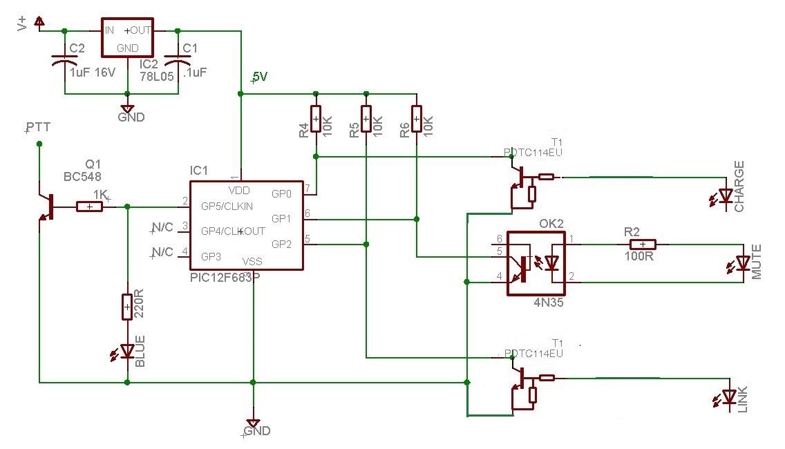 De belangrijkste voorwaarde waaraan voldaan moet worden om überhaupt te kunnen zenden is dat LINK “aan” is en CHARGE “uit”. Als aan deze twee condities is voldaan kan met de MUTE functie de PTT aan en uitgeschakeld worden. De LINK wordt op twee manieren geactiveerd; als de headset van het basisstation wordt verwijdert, of indien op de multifunctionele toets op de headset wordt gedrukt. Hierna moet je al kunnen luisteren/ontvangen. Wordt vervolgens de MUTE functie geactiveerd (door twee keer kort achter elkaar op de “-“toets op de headset te drukken) dan wordt de microfoon gedeactiveerd en staat de UNIT gereed op de PTT te activeren. Je kunt nu wel wel alles horen/ ontvangen maar hoort wel iedere 15 sec. een zachte dubbele toon ten teken dat de microfoon ge-MUTE is. Druk je vervolgens nogmaals twee keer kort de “-“ toets in dan wordt de PTT en je microfoon geactiveerd en kun je dus spreken. Om weer op ontvangst over te schakelen druk je gewoon weer twee keer kort de “-“toest op de headset in. Over de software kan ik weinig zeggen. Ik heb deze gewoon van de site geplukt van VK3KBC en in de PIC geprogrammeerd met mijn K150 programmer.