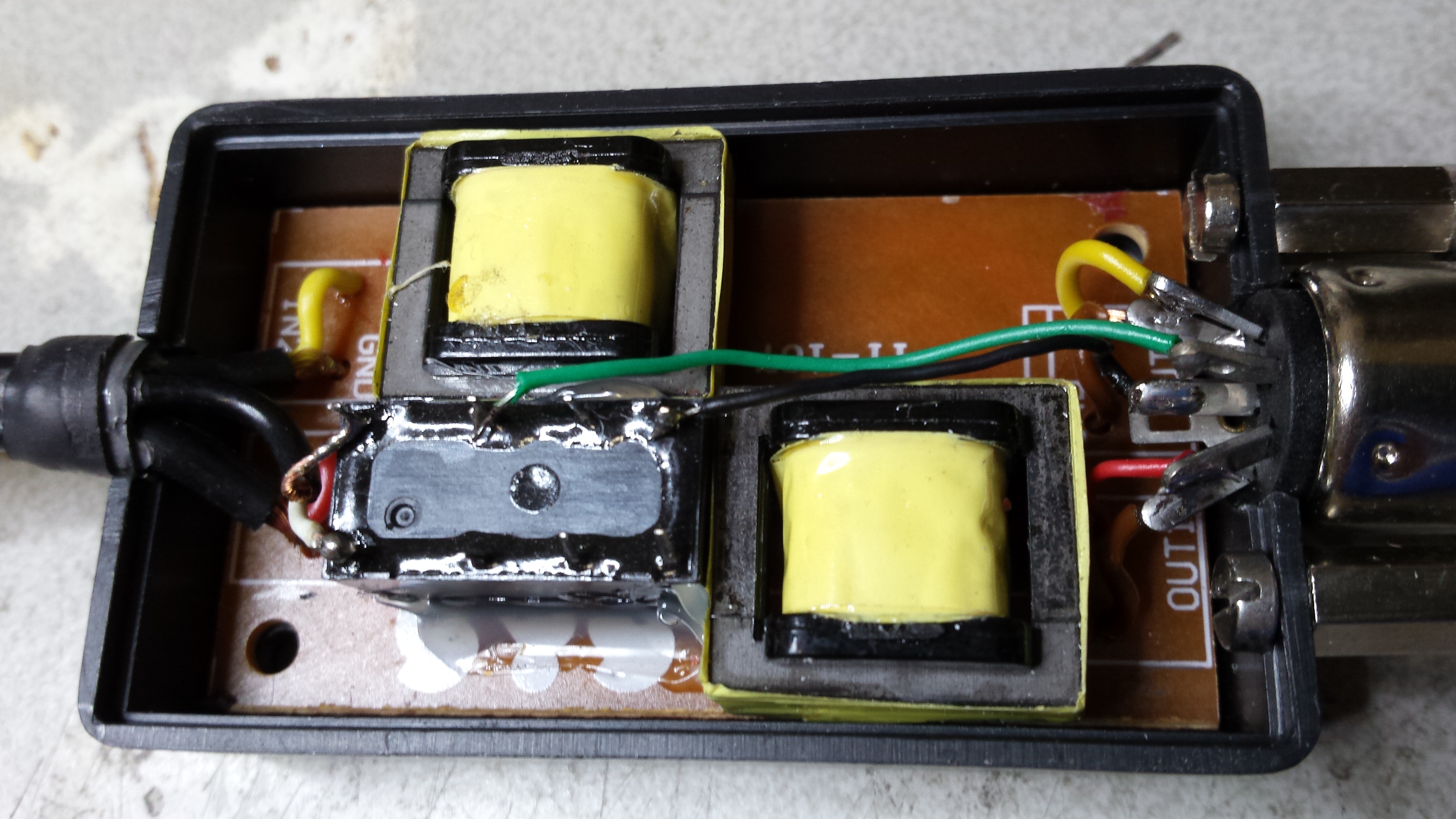 Voor de massa gewoon een beetje lak weg krabben met een scherp mesje. Hoe je de audiokabels aan de transceiver aansluit kun je zelf bepalen. Houd er echter rekening mee dat veel tranceivers waaronder ook mijn IC-7000 een zogenaamde floating Ground hebben voor de MIC ground. Zelf heb ik een universele audio scheidingstrafo gebruikt zoals hier op de foto. Daar zit ook mijn PTT relais is die aan de PTT-interface is verbonden. Ik schakel de PTT dus volledig potentiaal vrij, wat soms aanzienlijk minder problemen geeft.